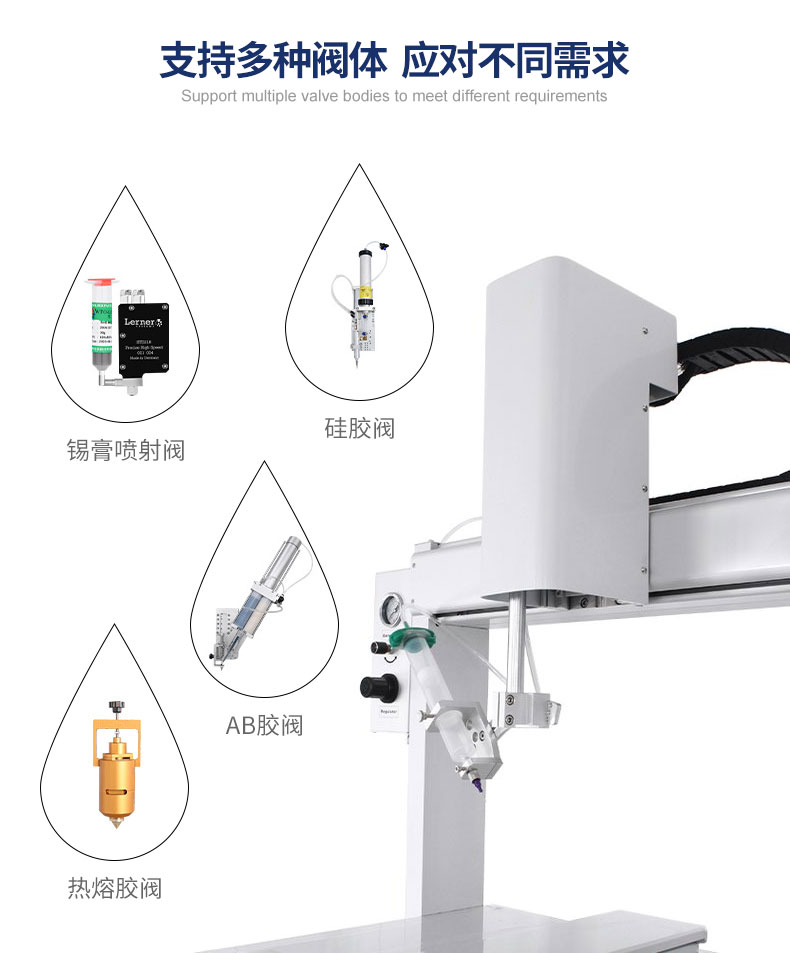可实现快速点胶粘接、灌注、涂层、密封、填充等工艺,适用于LCD液晶屏、COB、扬声器、喇叭、电源适配器、电子玩具、鸣器、电子元器件、家用电器等领域。