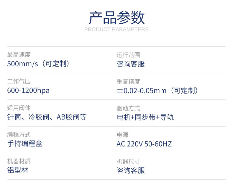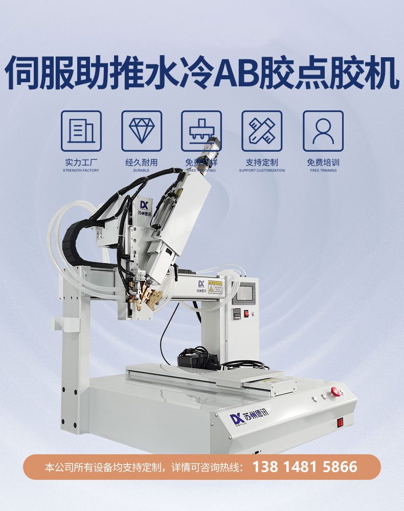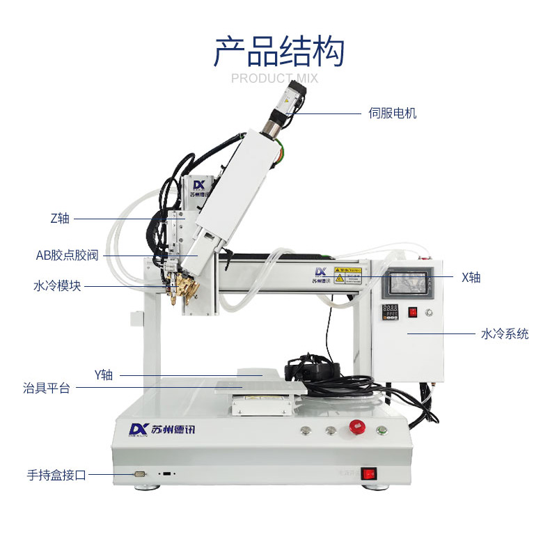伺服电机助推,水冷系统冷却胶水,AB胶双组份胶水适用。三轴坐标定位,手持编程盒设定点胶轨迹,点胶速度等。