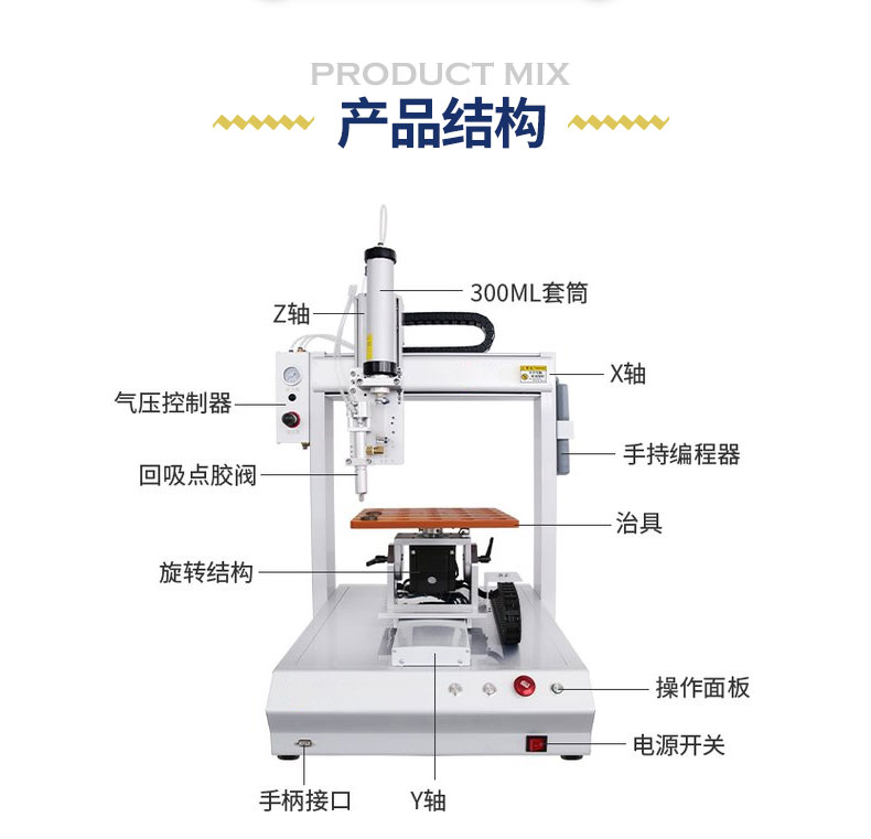 可实现快速点胶粘接、灌注、涂层、密封、填充等工艺,适用于LCD液晶屏、COB、扬声器、喇叭、电源适配器、电子玩具、鸣器、电子元器件、家用电器等领域。
