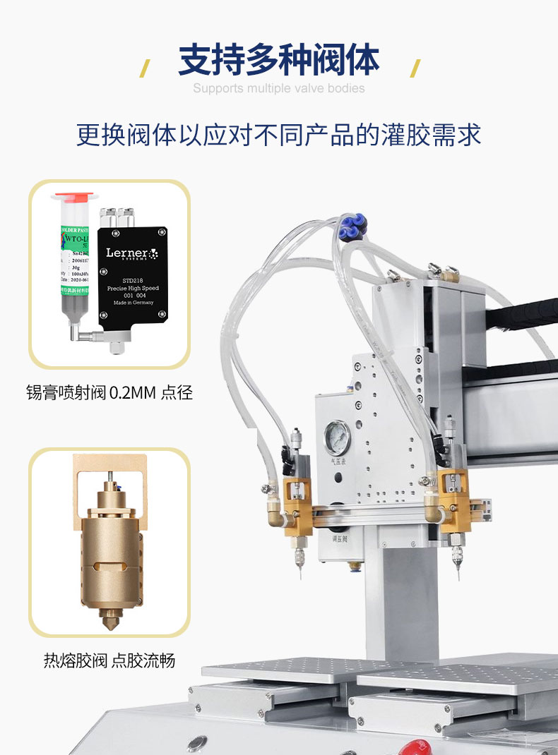 可实现快速点胶粘接、灌注、涂层、密封、填充等工艺,适用于LCD液晶屏、COB、扬声器、喇叭、电源适配器、电子玩具、鸣器、电子元器件、家用电器等领域。