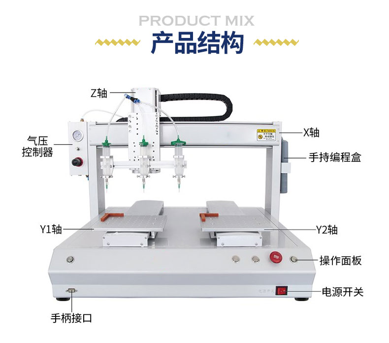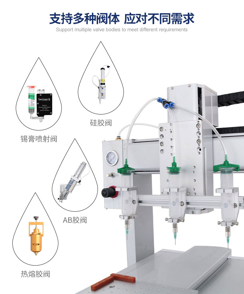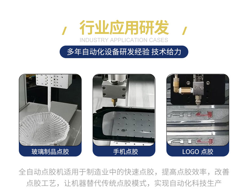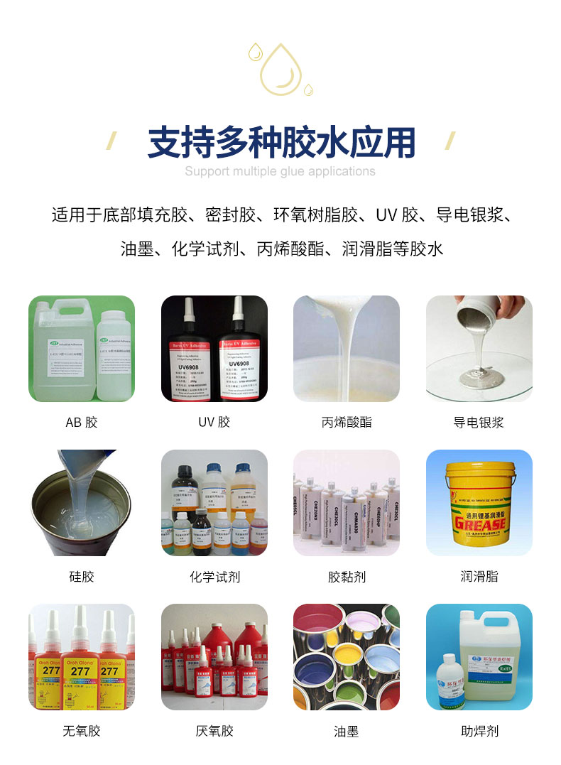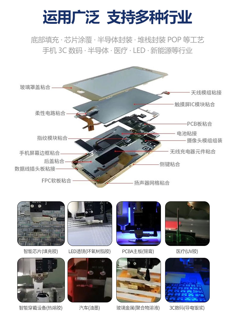 可实现快速点胶粘接、灌注、涂层、密封、填充等工艺,适用于LCD液晶屏、COB、扬声器、喇叭、电源适配器、电子玩具、鸣器、电子元器件、家用电器等领域。