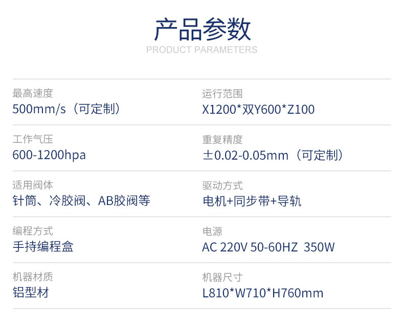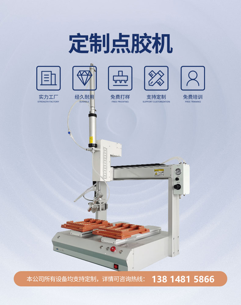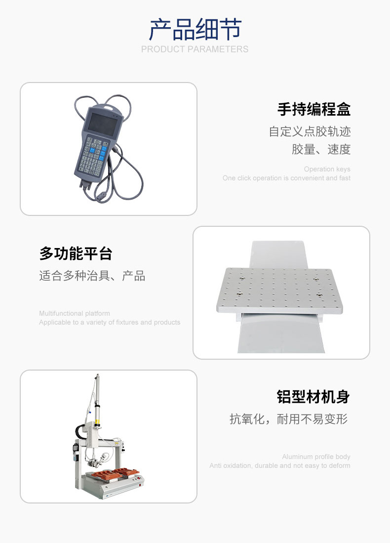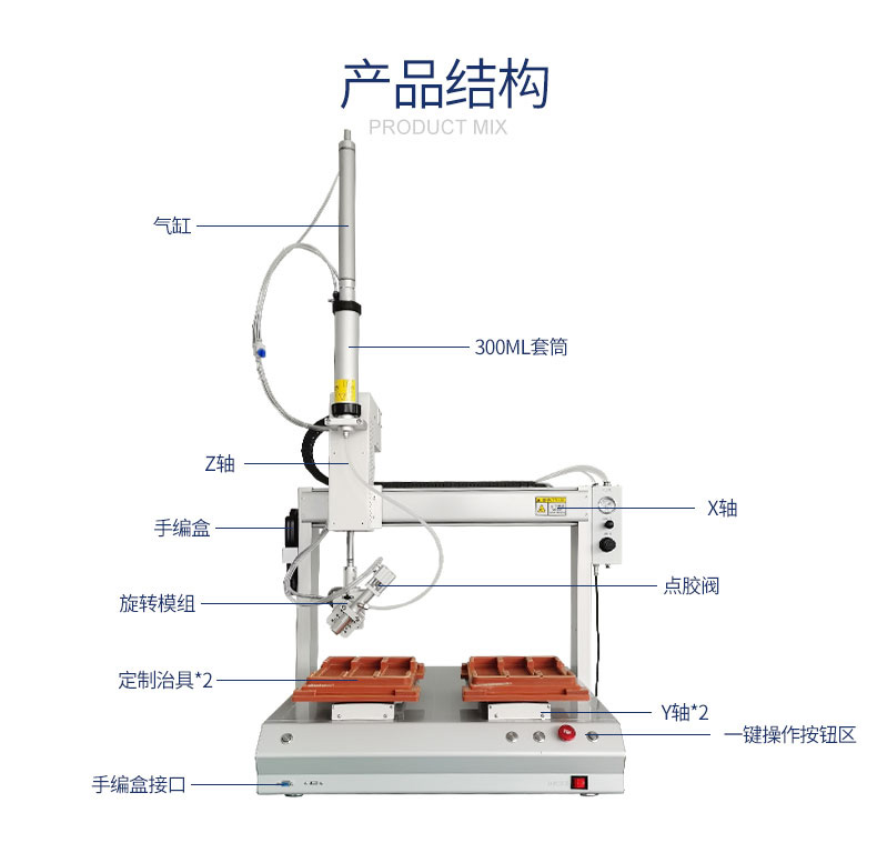 该方案使用的双工位平台,Z轴装置300ML套筒+气缸助推,旋转轴上采用旋转模组机构,实现更多更复杂的点胶方案,适应更多产品点胶。